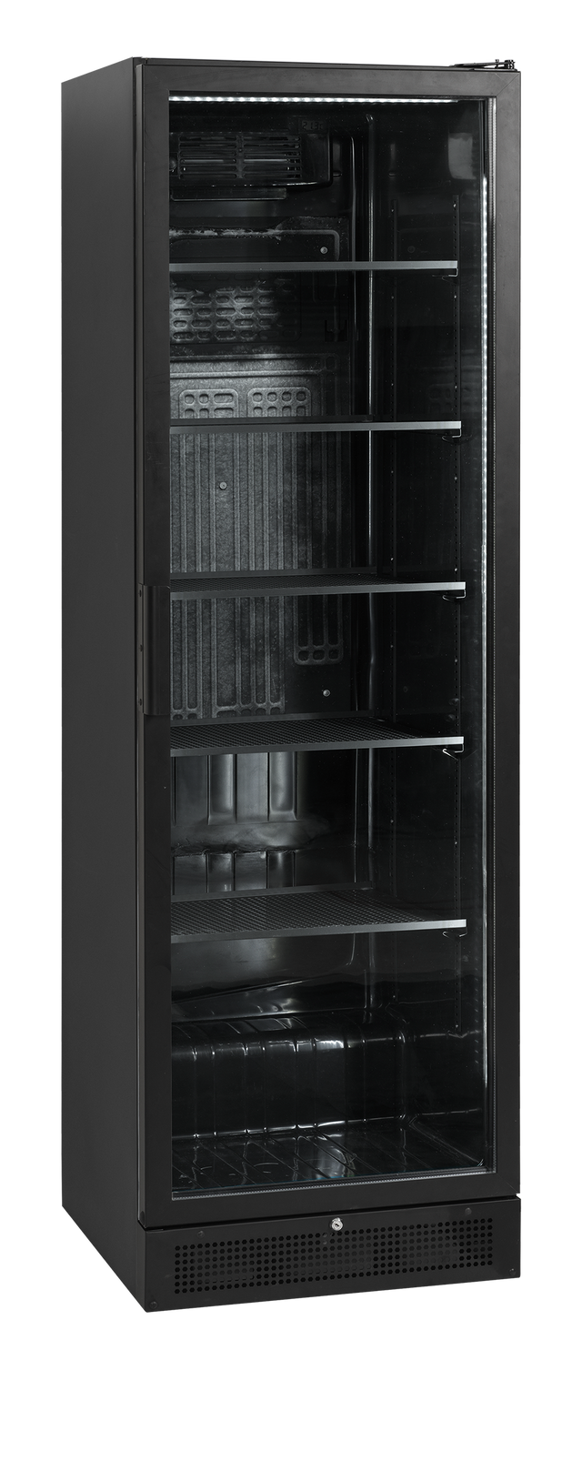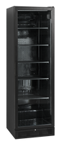 These bottle coolers elevate the standard for cost-effective display refrigeration. The sleek black exterior and interior lends an air of sophistication. This chiller features a full-height, reversible glass door with an aluminum frame, adjustable shelving, and LED interior lighting to enhance product visibility. A fan-assisted cooling system ensures ideal temperature distribution throughout the unit.