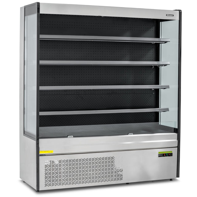 Stainless steel exterior & black interior | 4 heavy duty adjustable shelves (300mm deep) with pricing strips | Condenser over temperature audible alarm | Adjustable feet | Night blind fitted as standard | Internal illumination - LED lighting to each shelf | Tempered glass side panels | Clear acrylic shelf edge risers |