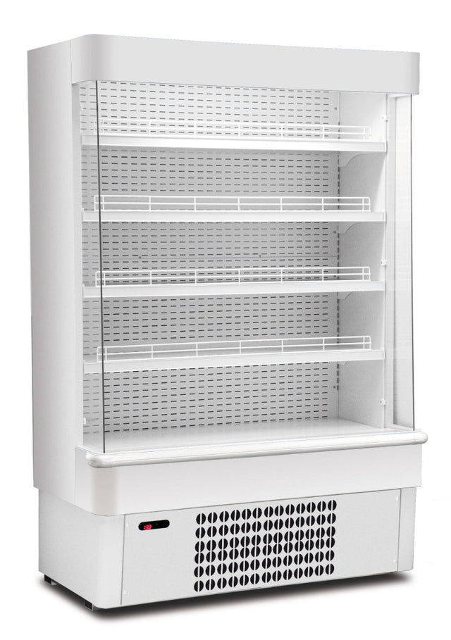 White laminated exterior & interior|4 shelves with ticket strip and shelf edge stopper|Night blind as standard|Internal illumination|Tempered glass side panels|Castors as standard|