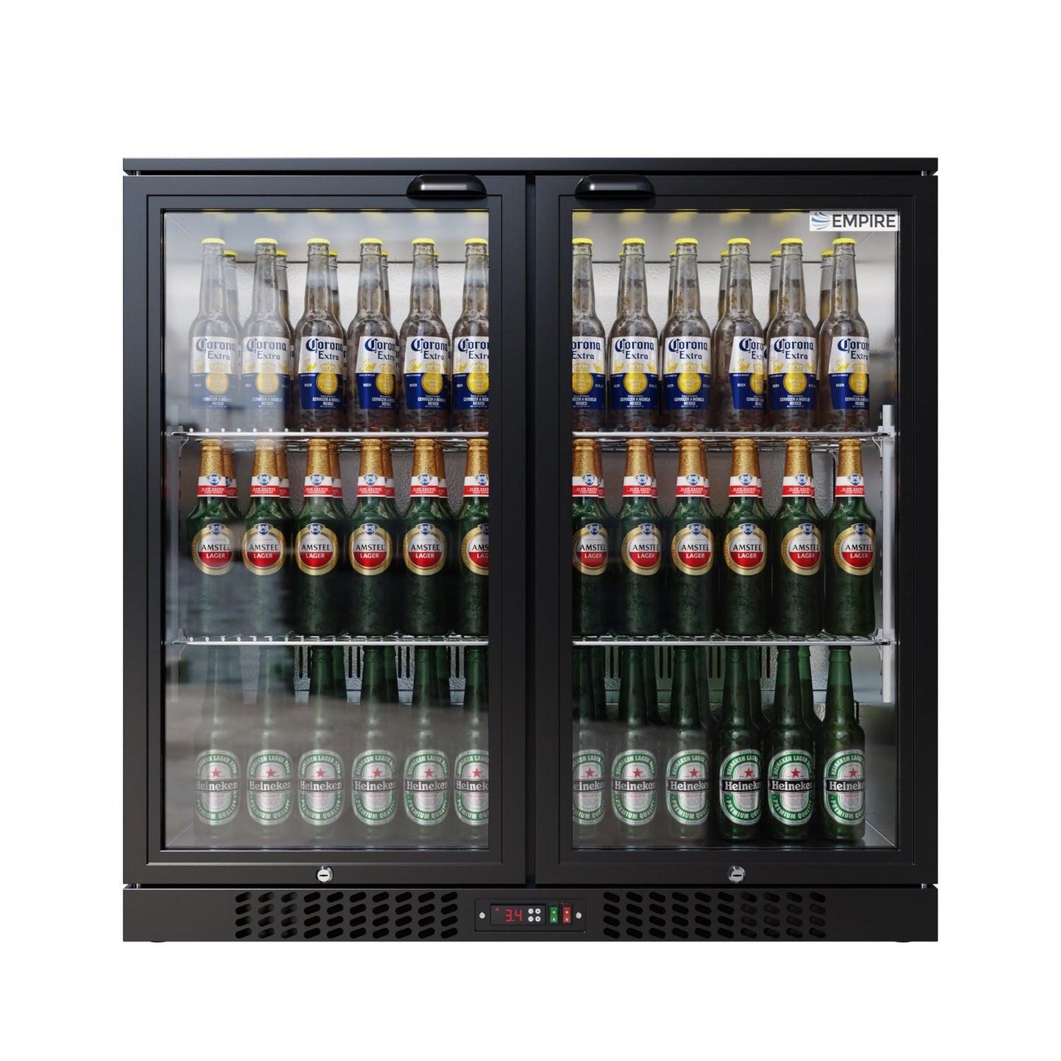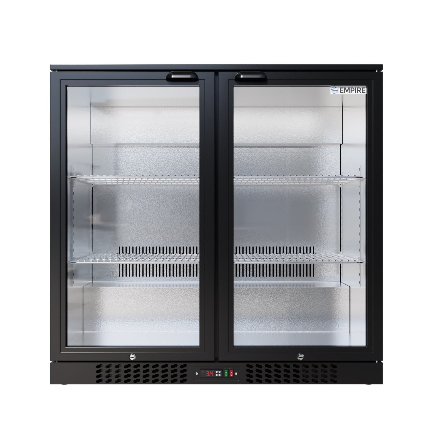 The Empire double hinged door back bar chiller in Black with LED Lighting is perfect for keeping your best sellers chilled and ready at your disposal. With two large, clear doors, this multipurpose beer fridge comes with a range of useful features, including an integral temperature controller and auto defrost.