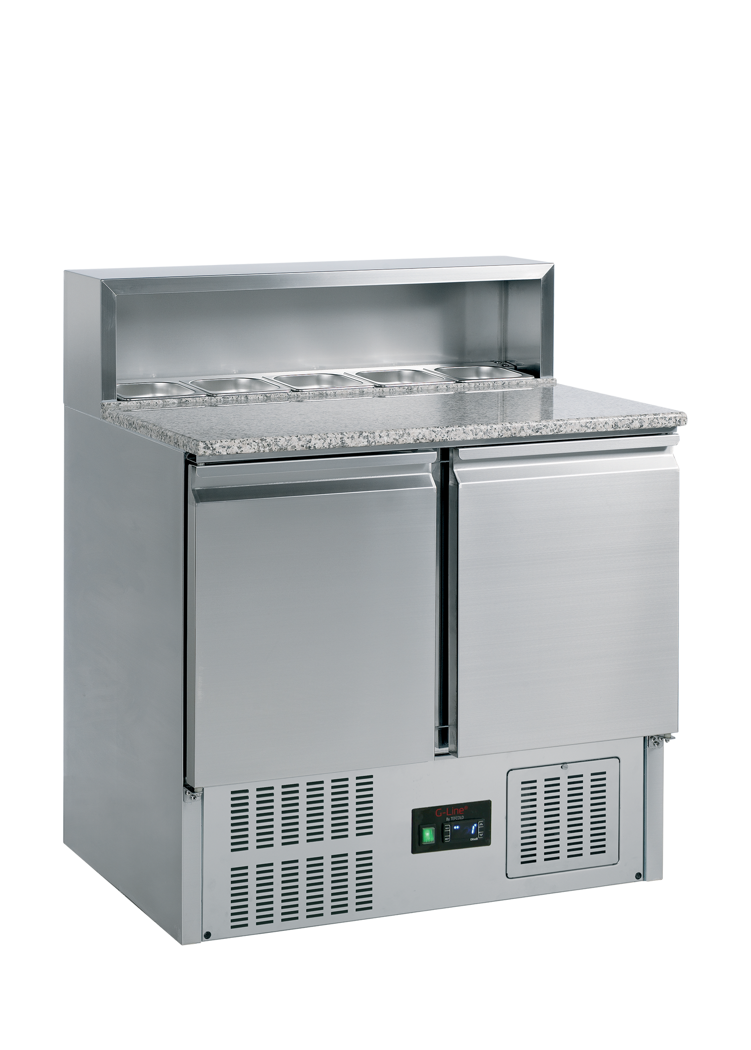 Stainless steel pizza counters with stylish granite tabletop. These value-for-money G-line pizza counters are fantastic for pizza preparation, making sure you have everything you need within reach. Line your ingredients up in size 1/6 GN pans (not included) and use the cupboards for storage and easy refills. The granite tabletop is great for creating delicious pizzas, staying cool, and making it harder for the dough to stick.