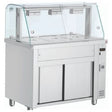 High grade AISI 304 stainless steel exterior & interior|With glass structure|Wet well accepts GN1/1 upto 150mm deep (not supplied)|Wet well bain marie with easy access drain tap|130W halogen lamps|Supplied with perspex sliding doors to rear of display area|