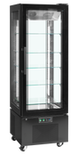 The UPD400C showcases products with double-glazed glass on all sides and a frameless door. Ideal for cakes and desserts, with optional wine shelves. It features a black steel exterior and a stainless steel interior with a mirror effect. Vertical LED lights and five adjustable glass shelves add versatility. The digital display controls ventilated cooling, with settings to prevent pastries from drying out. Mounted on castors for easy movement, it also comes in a freezer version.